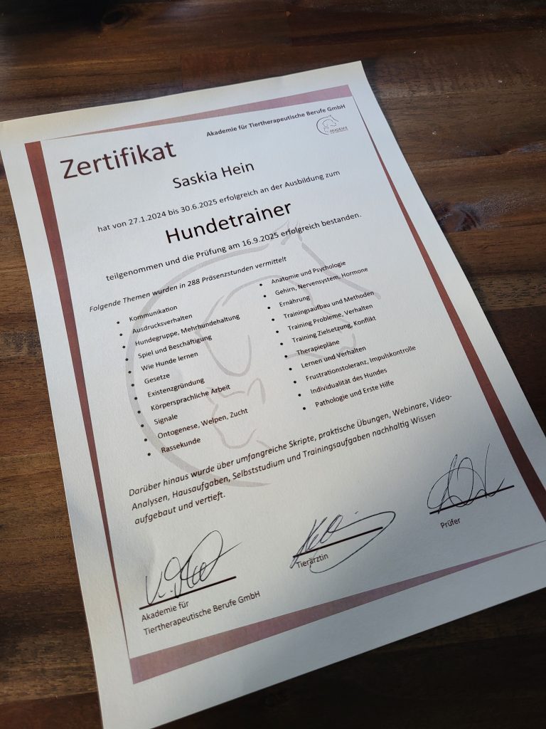 Im September 2025 war es so weit: Nach fast zwei Jahren habe ich die Ausbildung zur Hundetrainerin bei der Akademie für Tiertherapie in Babenhausen erfolgreich abgeschlossen.
